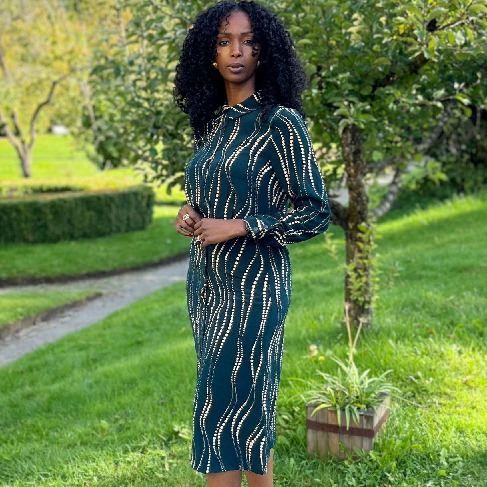 Møt Mina Dress Twirl, en herlig kjole i vevd viskose som inviterer til dans – bokstavelig talt! Den har lange ermer, klassisk krage, knapper hele veien ned og en svingende midi-lengde. Med en innsvinget midje, og lett fall – denne kjolen får deg garantert til å twirle med stil og selvtillit.