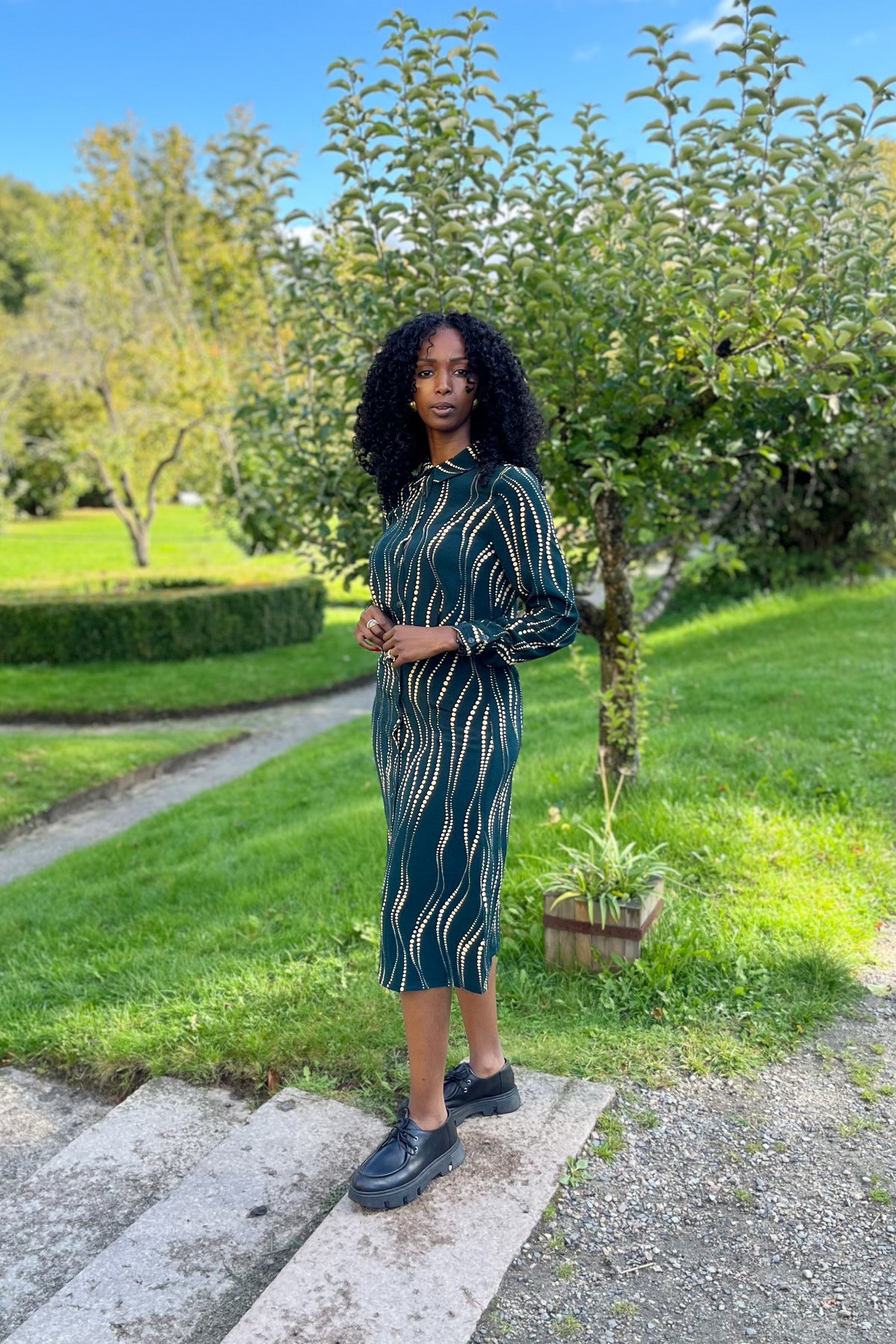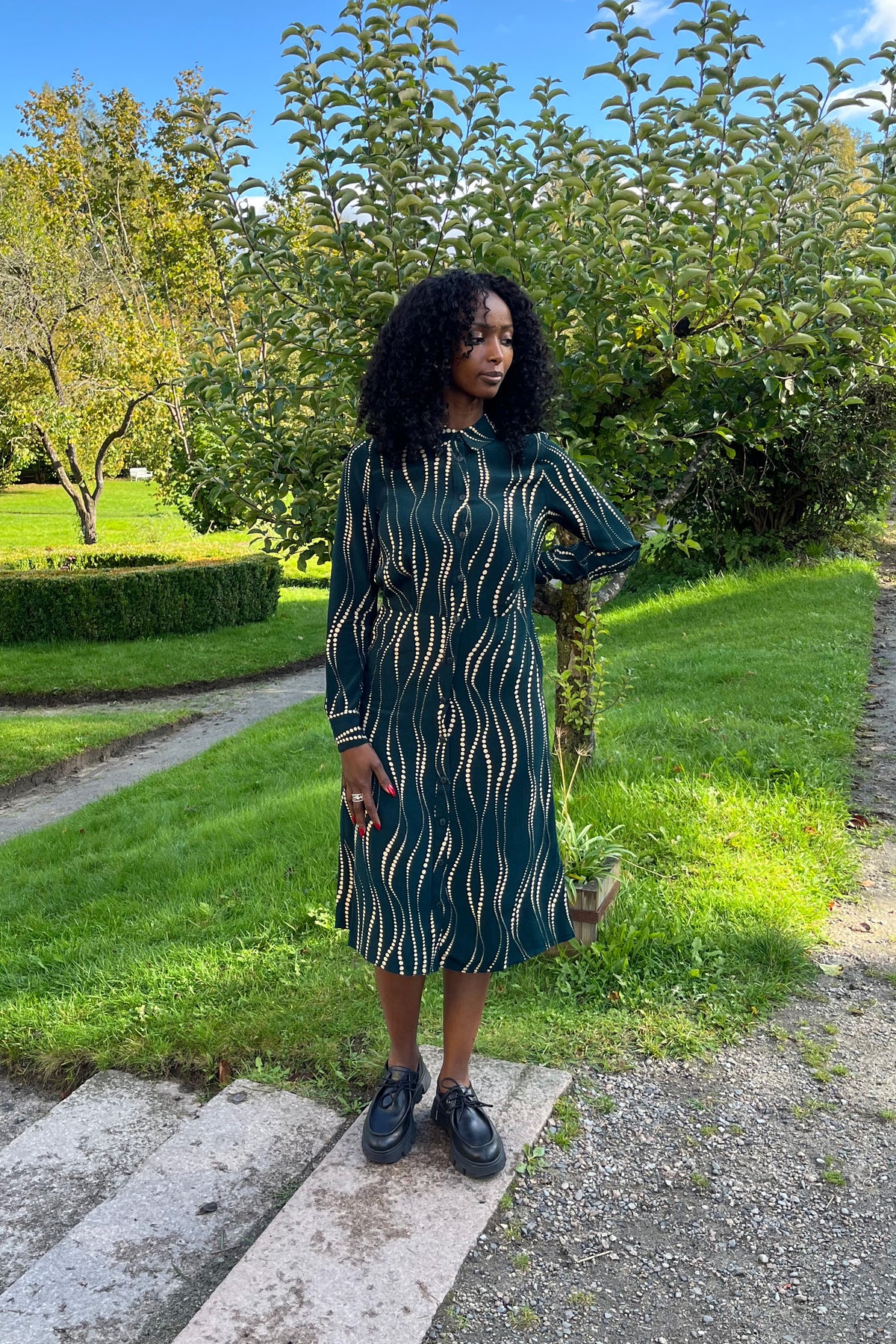 Møt Mina Dress Twirl, en herlig kjole i vevd viskose som inviterer til dans – bokstavelig talt! Den har lange ermer, klassisk krage, knapper hele veien ned og en svingende midi-lengde. Med en innsvinget midje, og lett fall – denne kjolen får deg garantert til å twirle med stil og selvtillit.