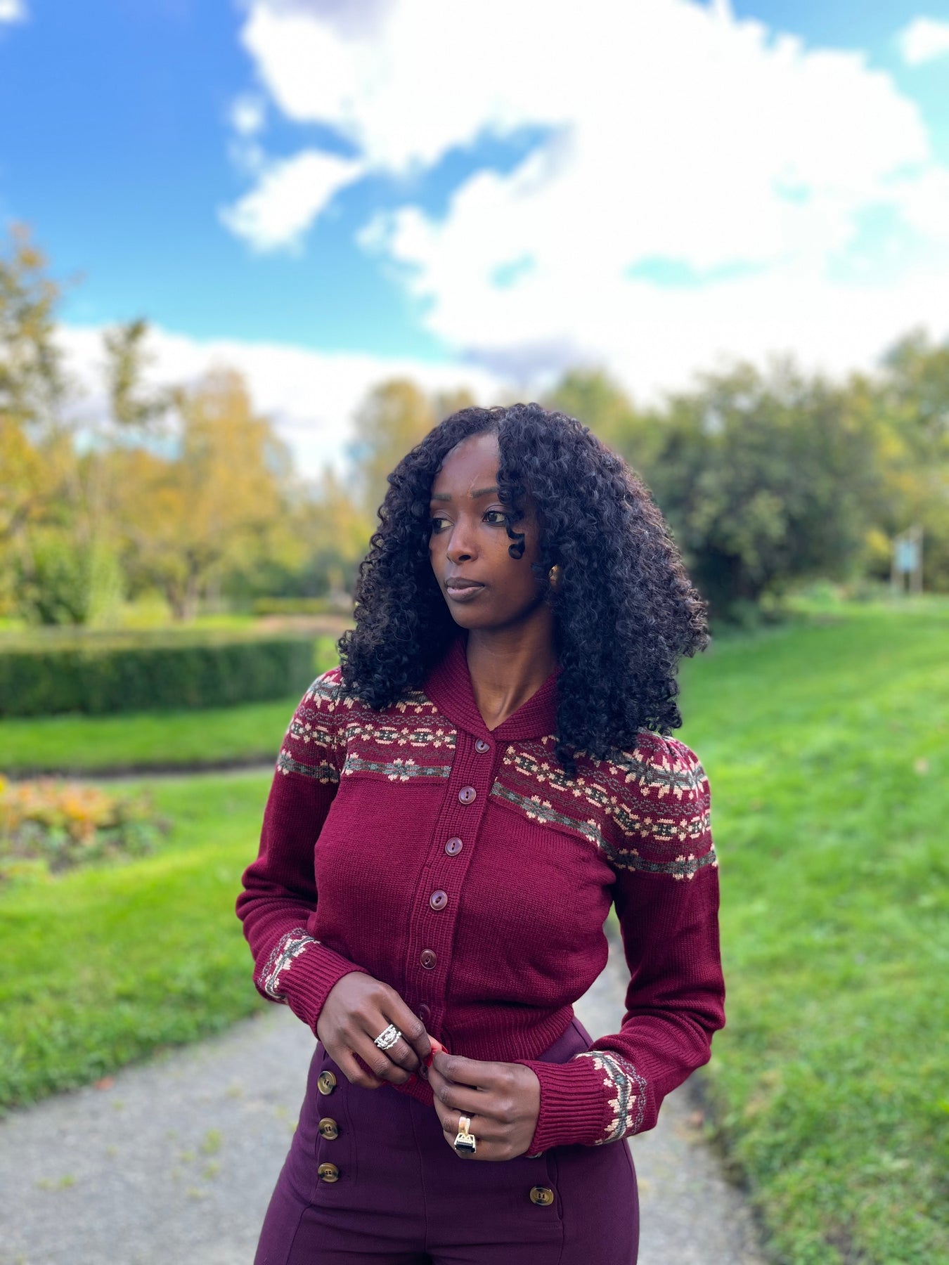 The Fair Isle Knit Jacket fra svenske Emmy Design er en klassisk, retroinspirert strikkejakke som både varmer og pynter. Strikket i 100 % superfin merinoull, gir den en tung og myk følelse samtidig som den holder deg lun på kalde dager. Den petroleumblå bunnfargen får et herlig løft av det tradisjonelle Fair Isle-mønsteret i skifergrønt, marine, sjokoladebrunt og plomme. Perfekt både til hverdagsbruk og til spesielle anledninger hvor du vil kombinere komfort med tidløs stil.