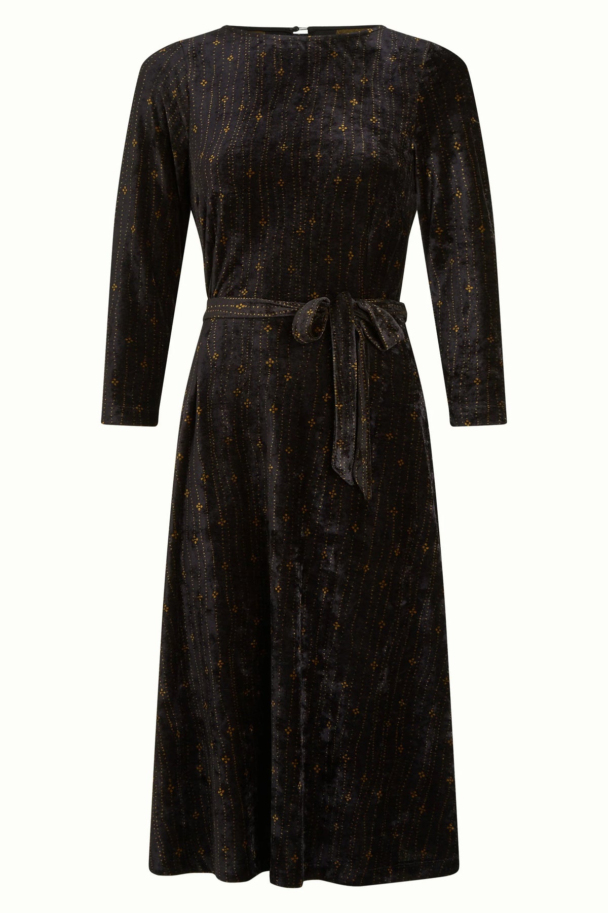 Joyce Dress Nieve er laget i en myk fløyelsviskose med komfort-stretch, og den faller vakkert langs kroppen og kjennes like myk og deilig som den ser ut. Den har et svakt glitrende blomstermønster trykket i stoffet, mens 3/4-lange ermer og rund hals gjør den både feminin og anvendelig.