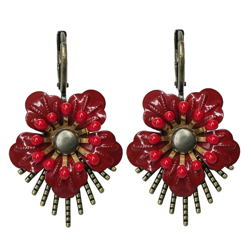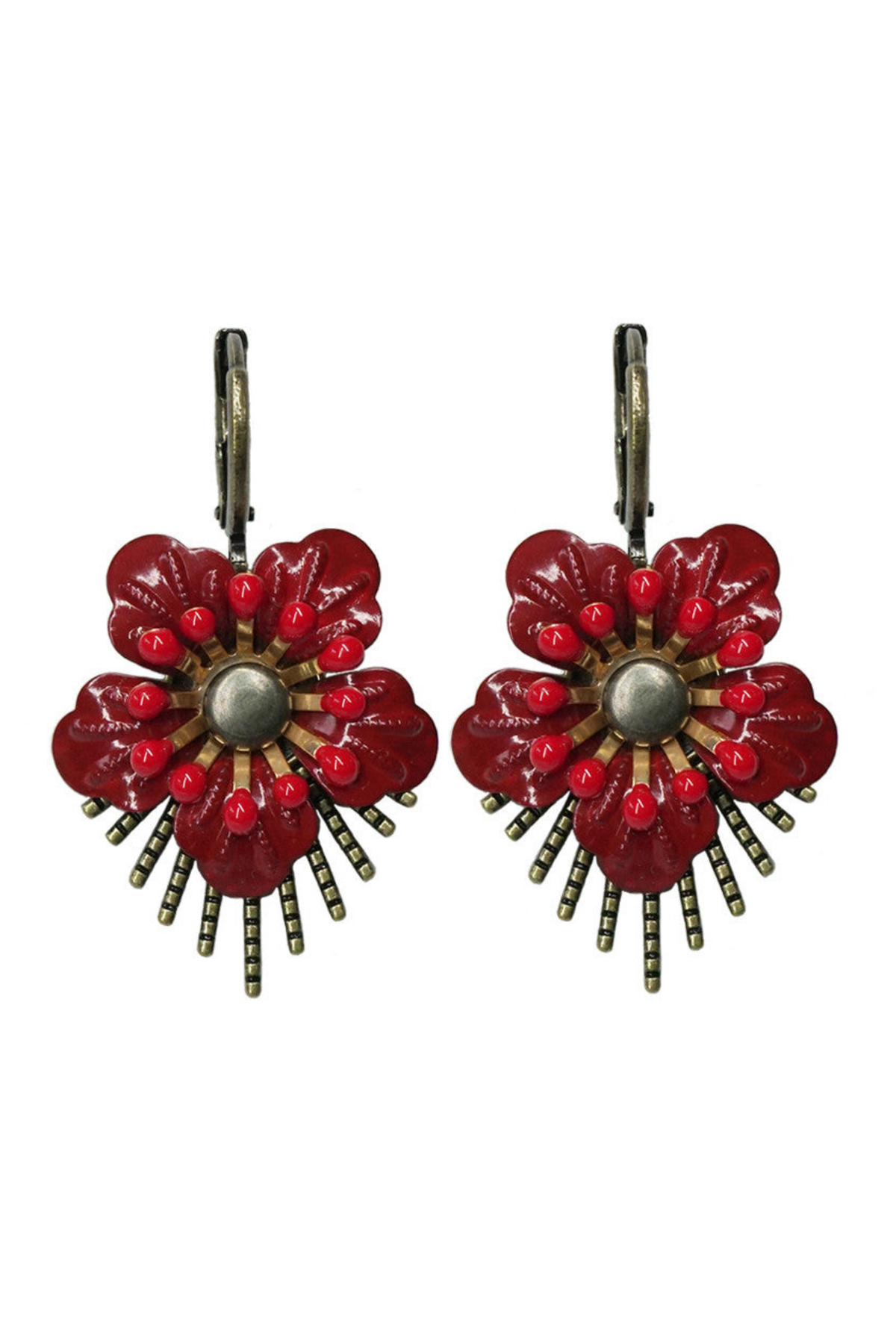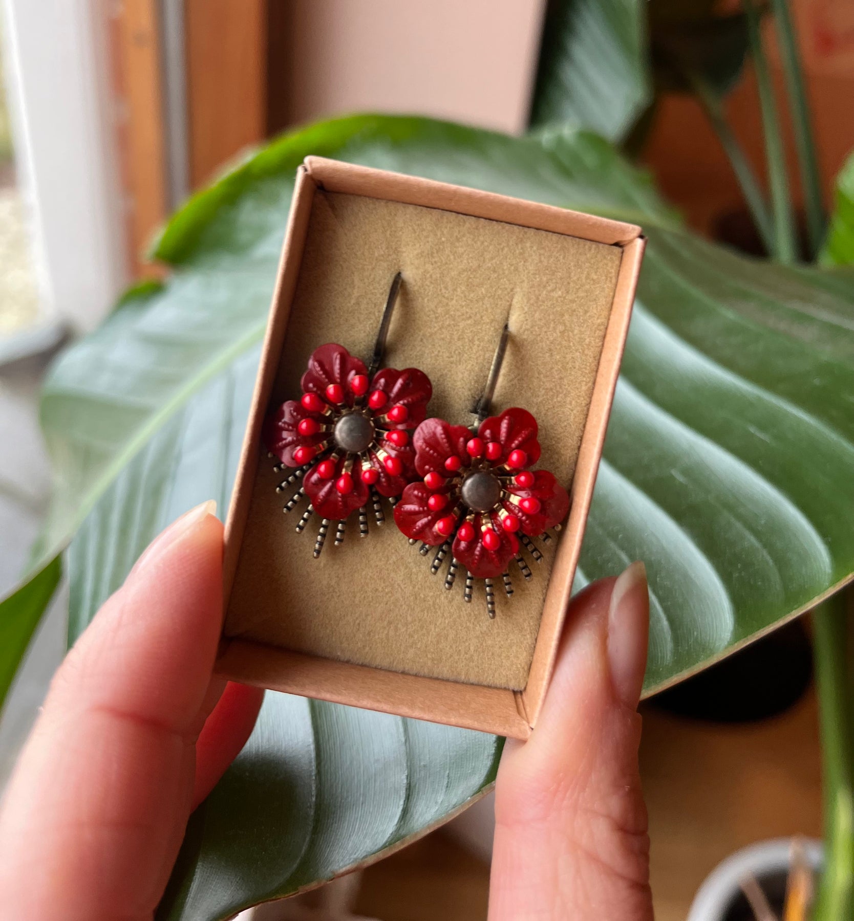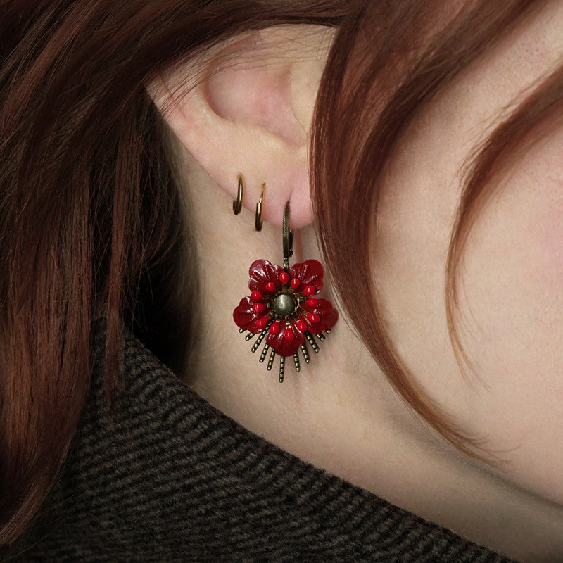 Øredobbene er laget med et gullbelagt messinganheng formet som en delikat “strålekrans”. På denne hviler et lite pigmentert blomsteranheng, dekorert med håndmalte emaljerte støvbærere. Ørekroken er i nikkelfritt, gullbelagt messing og er utstyrt med en smart klikkmekanisme som gjør øredobbene enkle å ta av og på – og behagelige å bruke hele dagen.