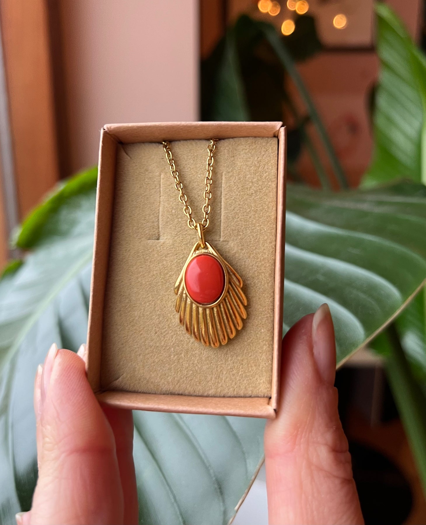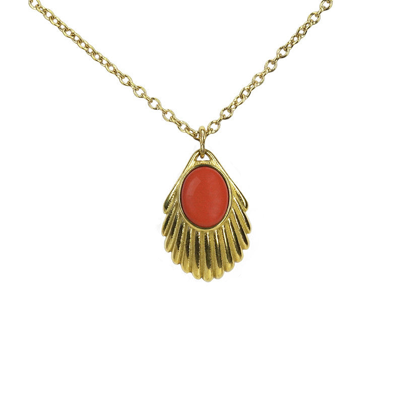 Selve anhengsformen er støpt av høykvalitets, gullbelagt stål, slik at smykket både er vakkert og slitesterkt. I midten sitter et glass-sten av opak, blodkorall-inspirert materiale. Den varme oransjerøde fargen kan ha naturlige, mørkere strøk – akkurat som ekte korall – noe som gir hvert smykke sin unike karakter.
