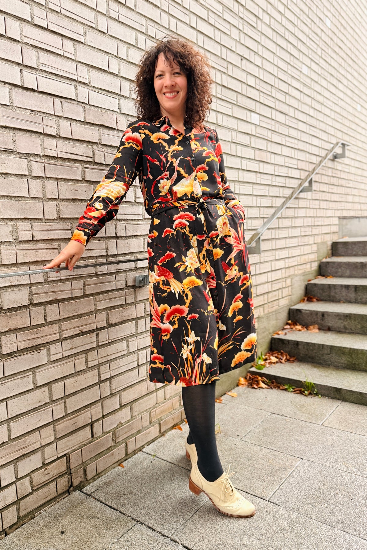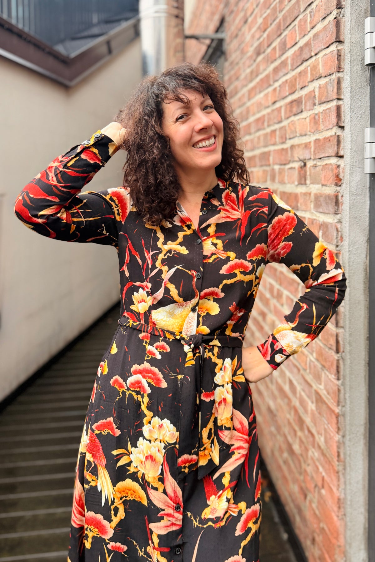 Olive Dress Neve er en tidløs kjole med vintage-sjarm og feminine detaljer. Den er sydd i en myk, vevd viskose uten stretch, som gir et lett og behagelig fall. Mønsteret i stoffet er helt nydelig, med et nikk mot Østen. Klassisk krage, knapper i front og lange ermer med mansjetter er dette en kjole som passer like godt på kontoret som på middag ute.