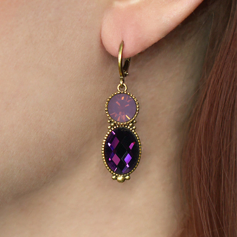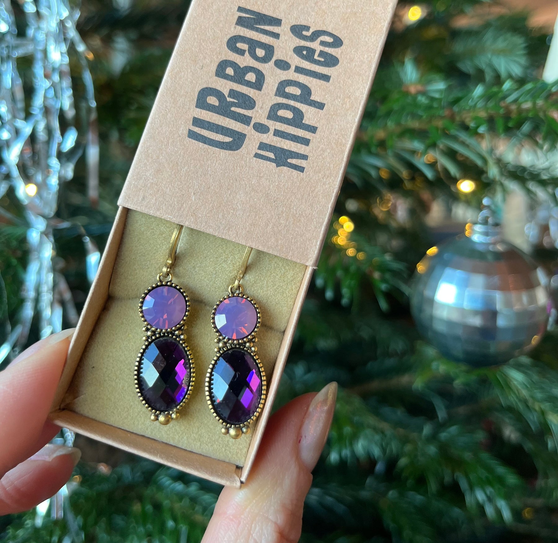 Tosca Red Facet er elegante øredobber med et hint av bohemsk luksus. Den nydelige lilla og fiolette fasetterte glass-steinen gir et vakkert spill i lyset, mens små rhinsteiner tilfører akkurat passe glans. Øredobbene er laget i messing med en matt, gyllen finish som gir et tidløst og sofistikert uttrykk.